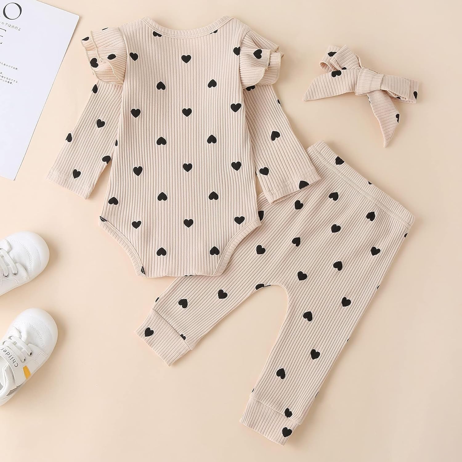 Baby Girl'S 3Pc Rib Frill Long Sleeve Romper and Pant Set