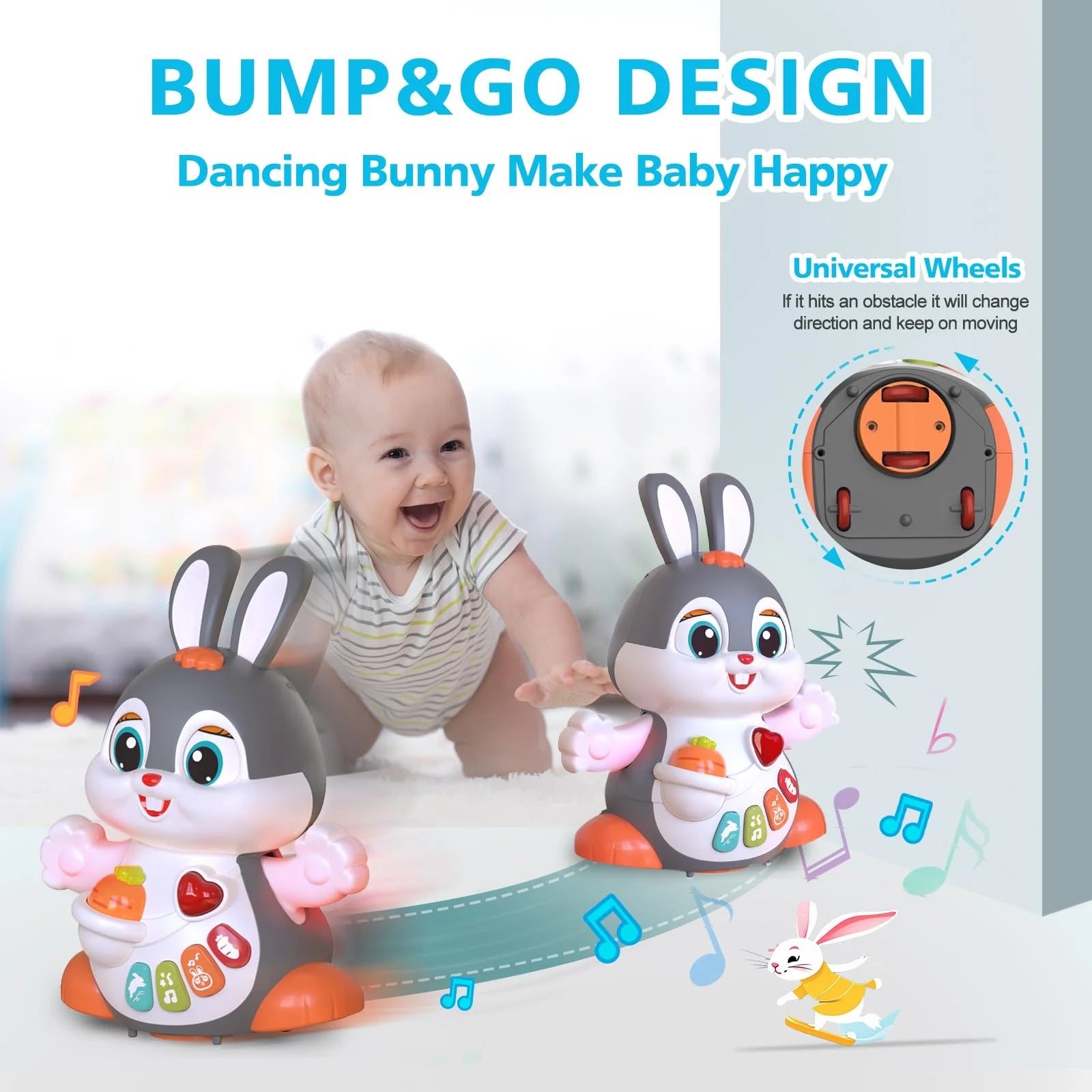 - 【Smart Crawling Coach】Transform playtime into movement adventures! The waddling bunny's unpredictable walking path paired with cheerful music motivates babies to crawl chase and cruise. It naturally strengthens core muscles and coordination skills - building physical confidence for those first independent steps!